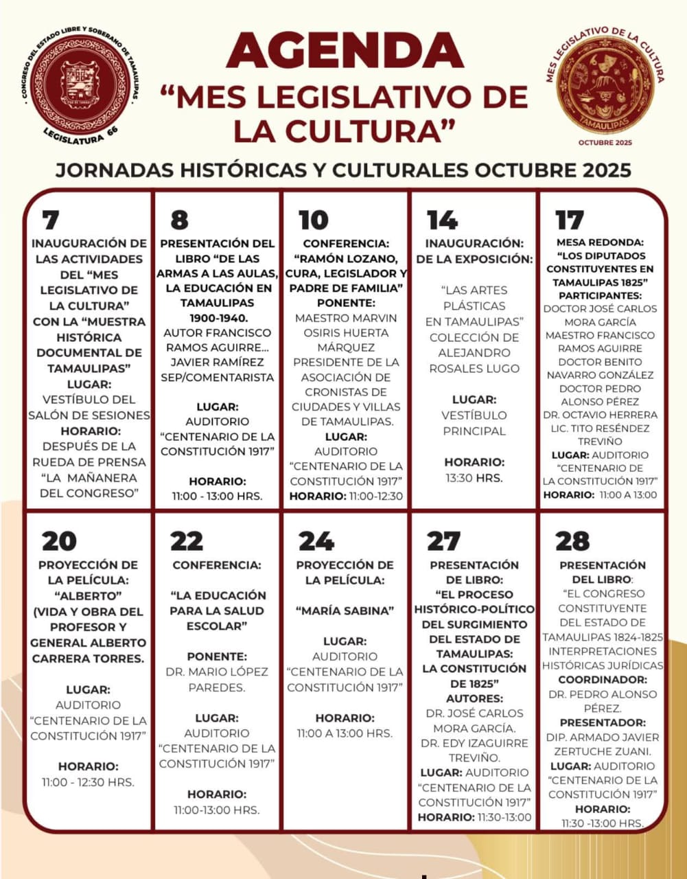 La programación, que dio inicio desde los primeros días de octubre, es impulsada por la Diputada Blanca Aurelio Anzaldúa Nájera, Presidenta de la Comisión de Cultura, y ha incluido conferencias, presentaciones editoriales, eventos conmemorativos y actividades dirigidas a diversos sectores de la sociedad.