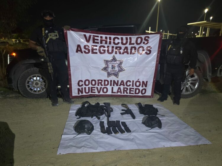 Nuevo Laredo, Tamaulipas.- Personal de la Guardia Estatal aseguró un vehículo, armamento y equipo táctico luego de repeler una agresión de civiles armados durante un recorrido de vigilancia en la colonia Infonavit Benito Juárez, en Nuevo Laredo.