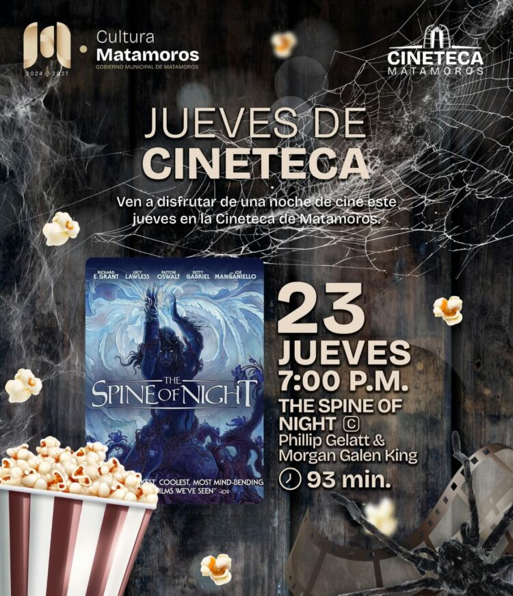 Matamoros, Tam.– El Gobierno de Beto Granados continúa impulsando la cultura y el entretenimiento para todas y todos los matamorenses a través del programa Jueves de Cineteca, una iniciativa que forma parte de la visión de Matamoros Renace. Este jueves, la pantalla grande presentará “The Spine of Night”, una obra animada que destaca por su estilo visual impactante y su narrativa que fusiona la fantasía y el terror de manera magistral.