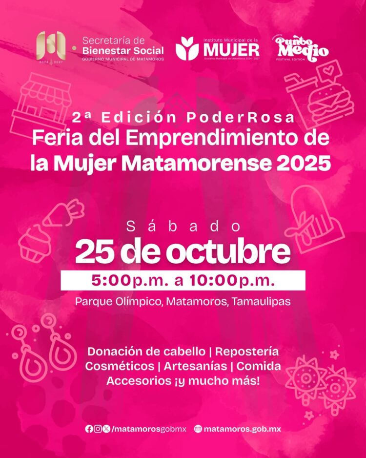 Matamoros, Tam.- El Gobierno de Beto Granados invita a todas las familias matamorenses a participar en la Feria del Emprendimiento de la Mujer Matamorense 2025 “PoderRosa”, que se llevará a cabo este sábado 25 de octubre en el Parque Olímpico. Este evento busca reconocer y fortalecer el papel de las mujeres emprendedoras, quienes con su creatividad y esfuerzo contribuyen al Renacimiento de Matamoros y al impulso de la economía local.
