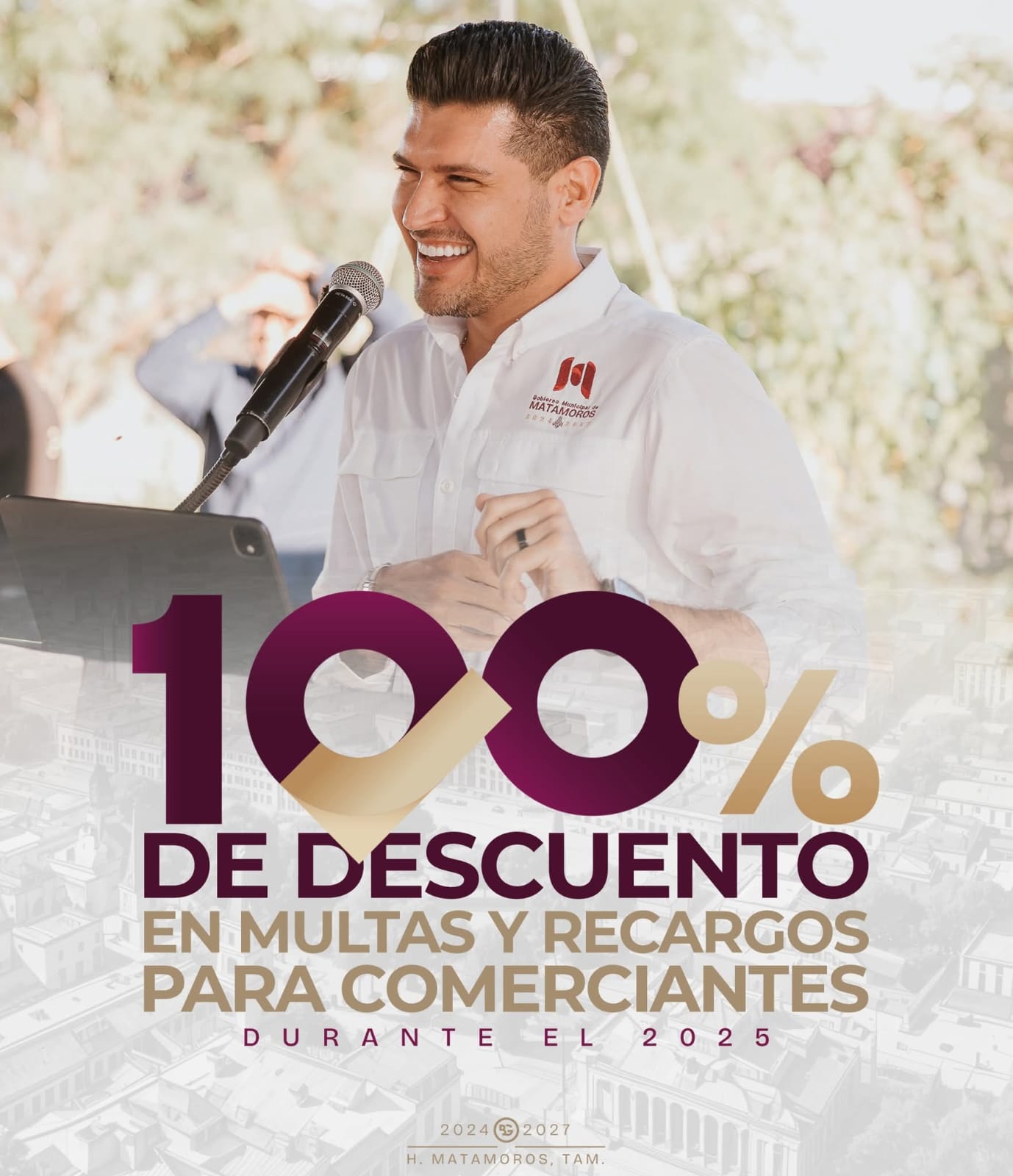 Matamoros, Tam.- El Gobierno Municipal que encabeza Beto Granados informó que, durante los meses de noviembre y diciembre, se ofrecerá un 100% de descuento en multas y recargos a los comerciantes de Matamoros, como parte de las acciones impulsadas para fortalecer la economía local y brindar apoyo a quienes día a día generan desarrollo y empleo en la ciudad.
