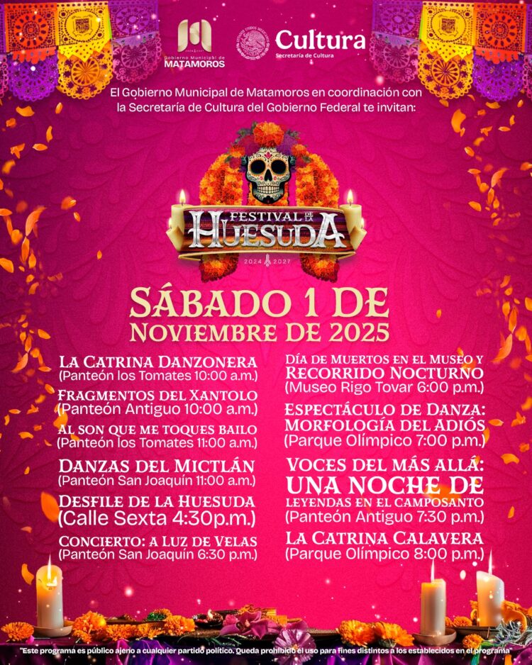 H. Matamoros, Tamaulipas.- El alcalde Beto Granados invita a los matamorenses a disfrutar del Festival de la Huesuda 2025, que continúa este sábado 1 de noviembre con un día lleno de tradición, arte y cultura que te hará vibrar.