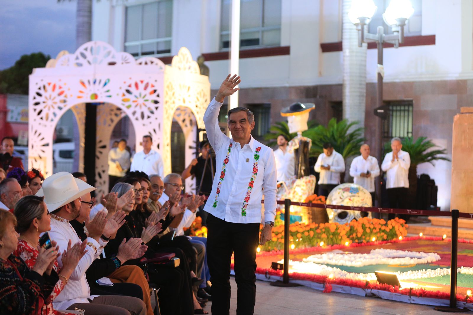 Ciudad Victoria, Tamaulipas.- En un ambiente impregnado por el aroma de la flor de cempasúchil, el pan de muerto y las luces de las velas, el gobernador Américo Villarreal Anaya y la presidenta del Sistema DIF Estatal, María de Villarreal presidieron la premiación del concurso estatal de catrinas y catrines «Almas Tamaulipecas» y la muestra del altar monumental del Día de Muertos en las escalinatas de Palacio de Gobierno .