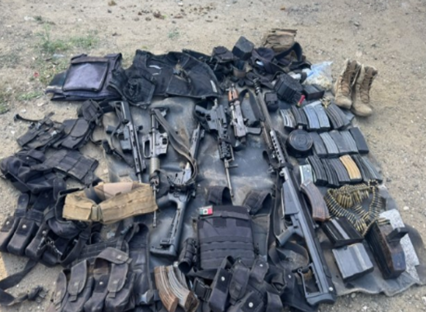 • En Baja California, elementos del Ejército Mexicano aseguraron dos armas largas, siete cargadores, 700 cartuchos, cinco chalecos tácticos y seis vehículos