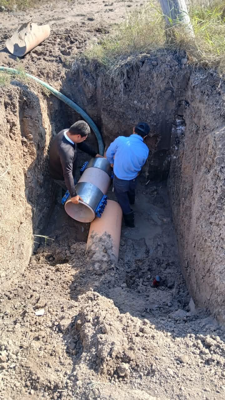 Matamoros, Tam.- El Gobierno de Matamoros, encabezado por el alcalde Beto Granados, a través de la Junta de Aguas y Drenaje de Matamoros, realizó trabajos de reparación en una línea de presión de 16 pulgadas ubicada en la calle Rincón de las Brisas y Brecha 30 del Fraccionamiento Rinconada de las Brisas. Estas labores se efectuaron con el objetivo de garantizar un servicio eficiente y continuo a las familias del sector.