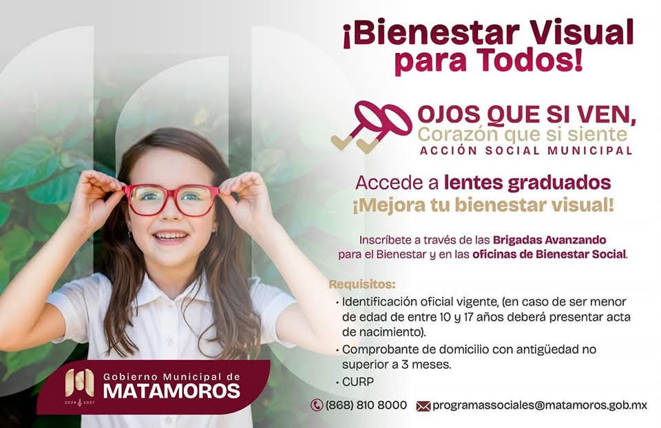 Matamoros, Tam.- El Gobierno de Beto Granados, a través de la Acción Social Municipal, invita a la ciudadanía a participar en el programa de lentes graduados, una iniciativa que busca mejorar la calidad de vida de niñas, niños, jóvenes, adultos y personas mayores que requieren apoyo para su bienestar visual.