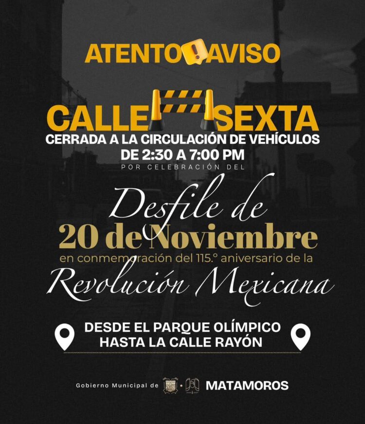 Matamoros, Tam.- El Gobierno de Matamoros, encabezado por Beto Granados, informó que con motivo del desfile conmemorativo del 20 de noviembre, la Calle Sexta permanecerá cerrada a la circulación vehicular este miércoles, en un horario de 2:30 de la tarde a 7:00 de la noche.