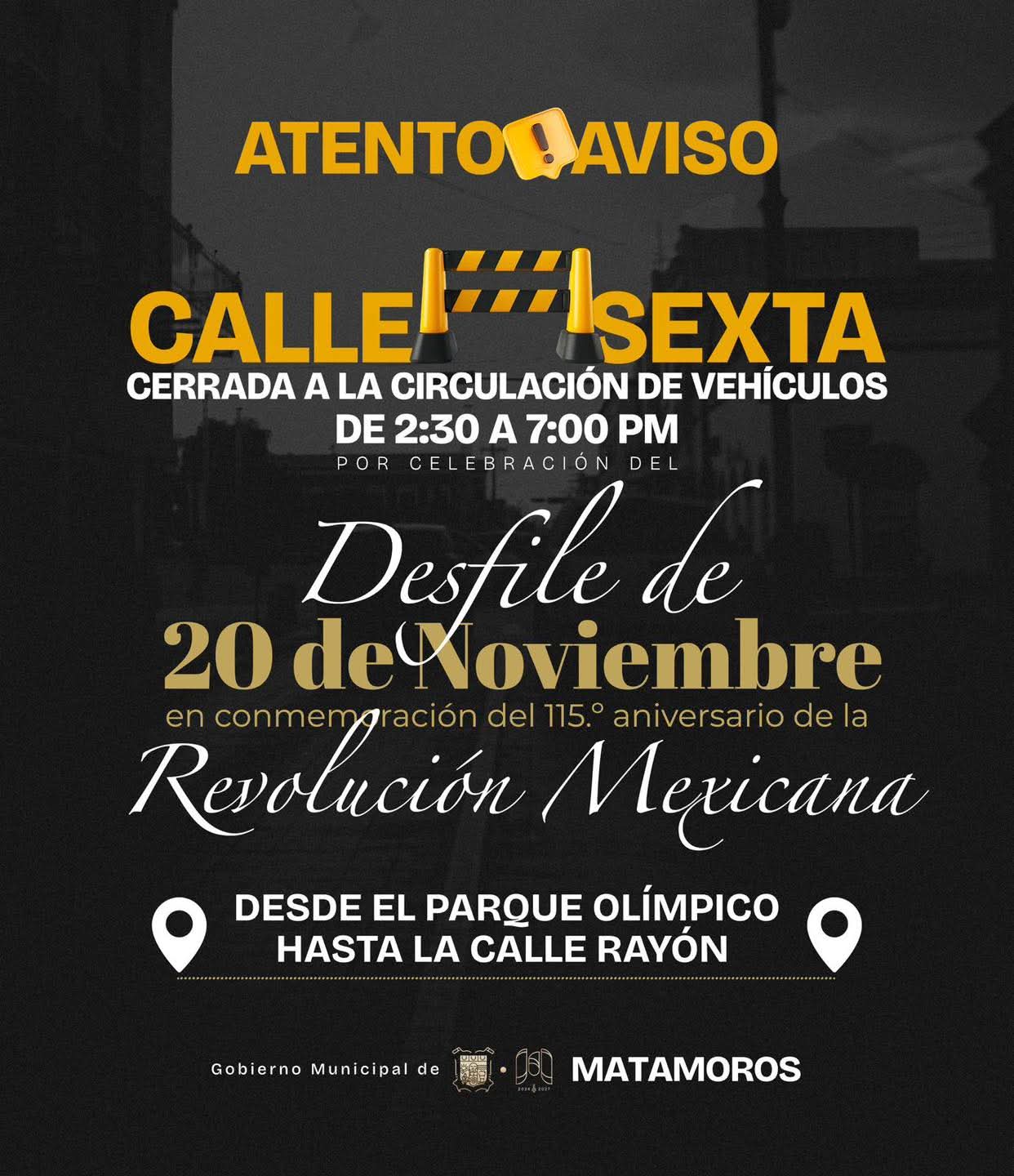 Matamoros, Tam.- El Gobierno de Matamoros, encabezado por Beto Granados, informó que con motivo del desfile conmemorativo del 20 de noviembre, la Calle Sexta permanecerá cerrada a la circulación vehicular este miércoles, en un horario de 2:30 de la tarde a 7:00 de la noche.