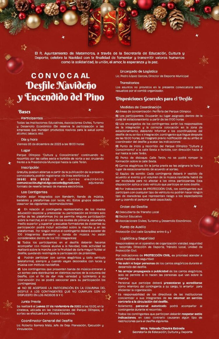H. Matamoros, Tamaulipas.- El presidente municipal Beto Granados, a través del Gobierno Municipal de Matamoros y la Secretaría de Educación, Cultura y Deporte, convoca a las instituciones educativas, asociaciones civiles y empresas a participar en el desfile navideño y encendido del pino 2025.