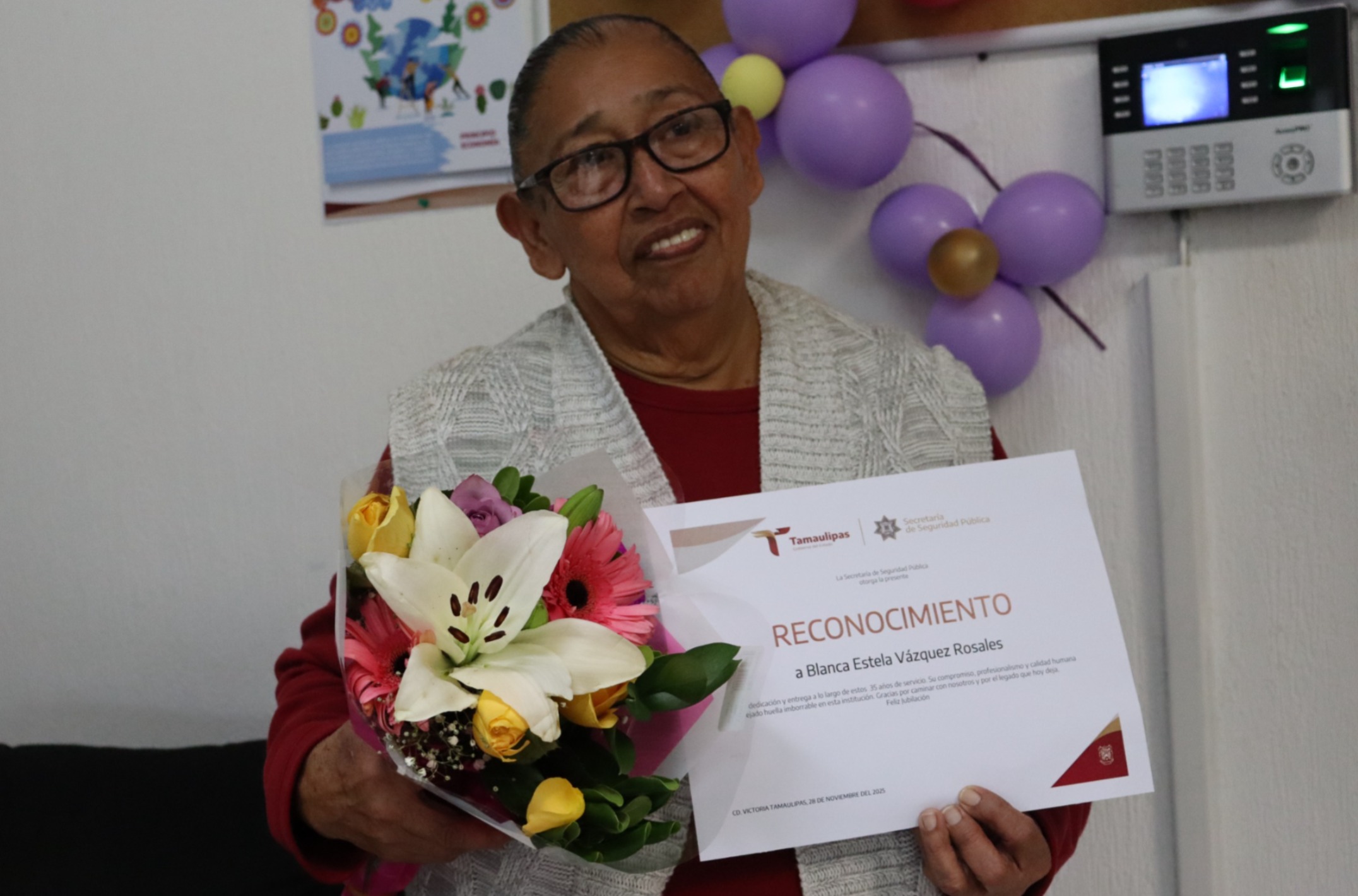 Ciudad Victoria, Tamaulipas.- Con una serenata con mariachi y abrazos de sus compañeros y compañeras, Blanca Estela Vázquez Rosales se despidió de la Secretaría de Seguridad Pública de Tamaulipas (SSPT) tras 35 años de servicio dentro de la Subsecretaría de Ejecución de Sanciones y Reinserción Social.