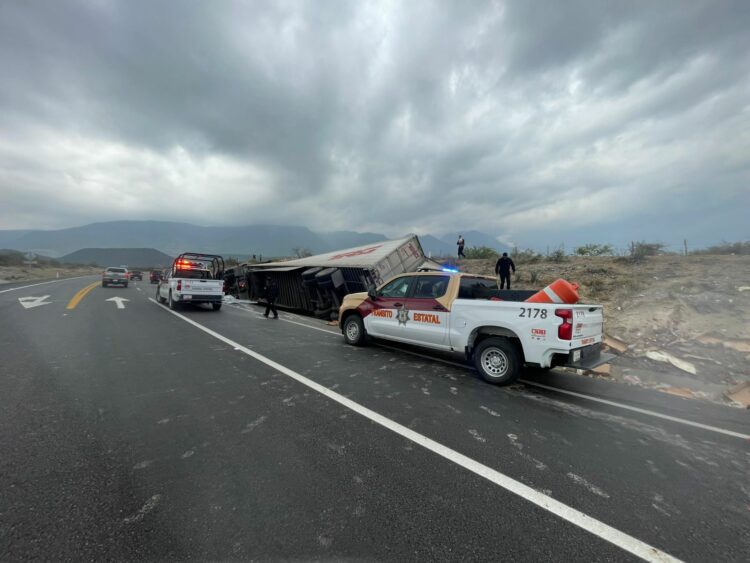 Jaumave, Tamaulipas.- En atención a un reporte ciudadano, personal de la Guardia Estatal de Apoyo Carretero comisionado a la Estación Segura Jaumave acudió al tramo Tula-Victoria de la Carretera Estatal 126 Rumbo Nuevo para brindar asistencia al conductor de un tractocamión cargado de fresas que se volcó cerca de la caseta en construcción.