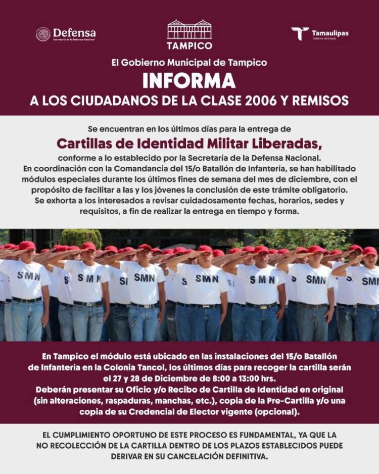 El Gobierno Municipal de Tampico les informa que están en los últimos días para recoger su Cartilla de Identidad Militar Liberada, conforme a lo establecido por la SEDENA.