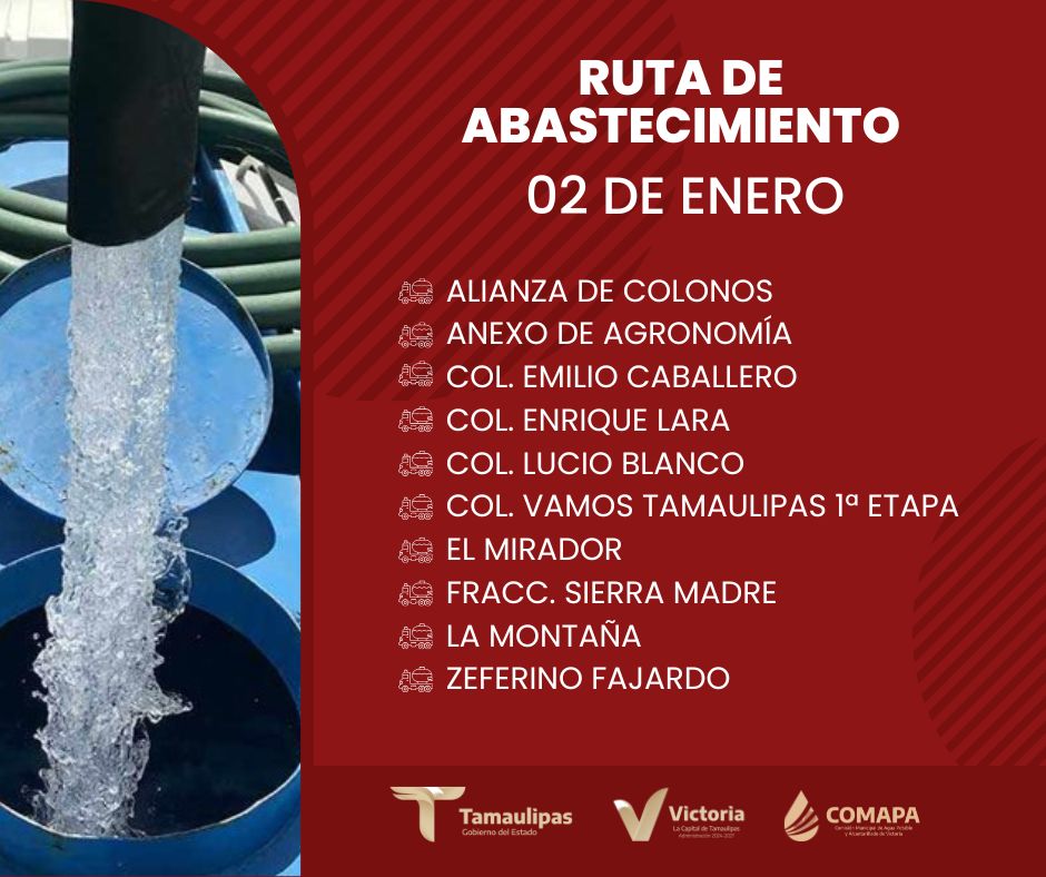 P谩gina de inicioMunicipios Redaccion en Municipios **En COMAPA Victoria trabajamos para que el agua llegue a cada rinc贸n de la ciudad. Te compartimos la ruta de abastecimiento a trav茅s de cami贸n cisterna. 馃挧 隆Juntos hacemos que el agua llegue a todos! Comparte esta informaci贸n con tus vecinos. 聽 Pr贸xima Lectura: **Invita Lalo Gatt谩s a cumplir con el impuesto predial. » Redaccion: Entrada Relacionada Gobierno de Beto Granados llama a mantener limpia la ciudad en este inicio de a帽o Por instrucci贸n del alcalde Beto Granados, contin煤an trabajos de limpieza en l铆neas de drenaje en la Abelardo de la Torre Gobierno de Beto Granados acerca el m贸dulo INAPAM a la ciudadan铆a