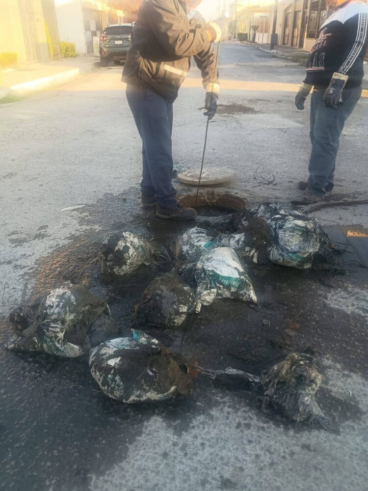 La obstrucción, provocada por costales, no permitía el libre paso de las aguas negras hacia el subcolector ubicado en la calle Abedul, en la colonia Mariano Matamoros.