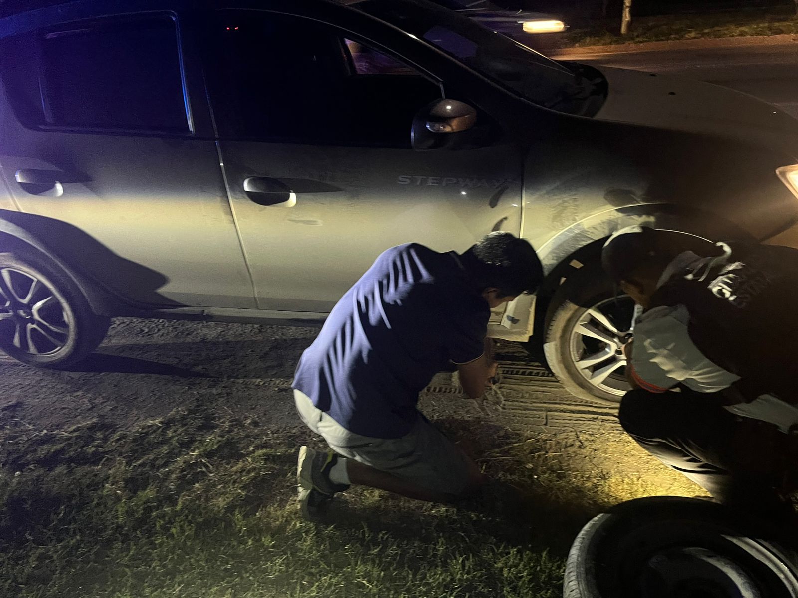 Tras verificar la información del vehículo, un Renault Sandero, y corroborar en Plataforma México que no presentaba irregularidades, se procedió a brindarle apoyo para el reemplazo de la llanta por la de refacción.