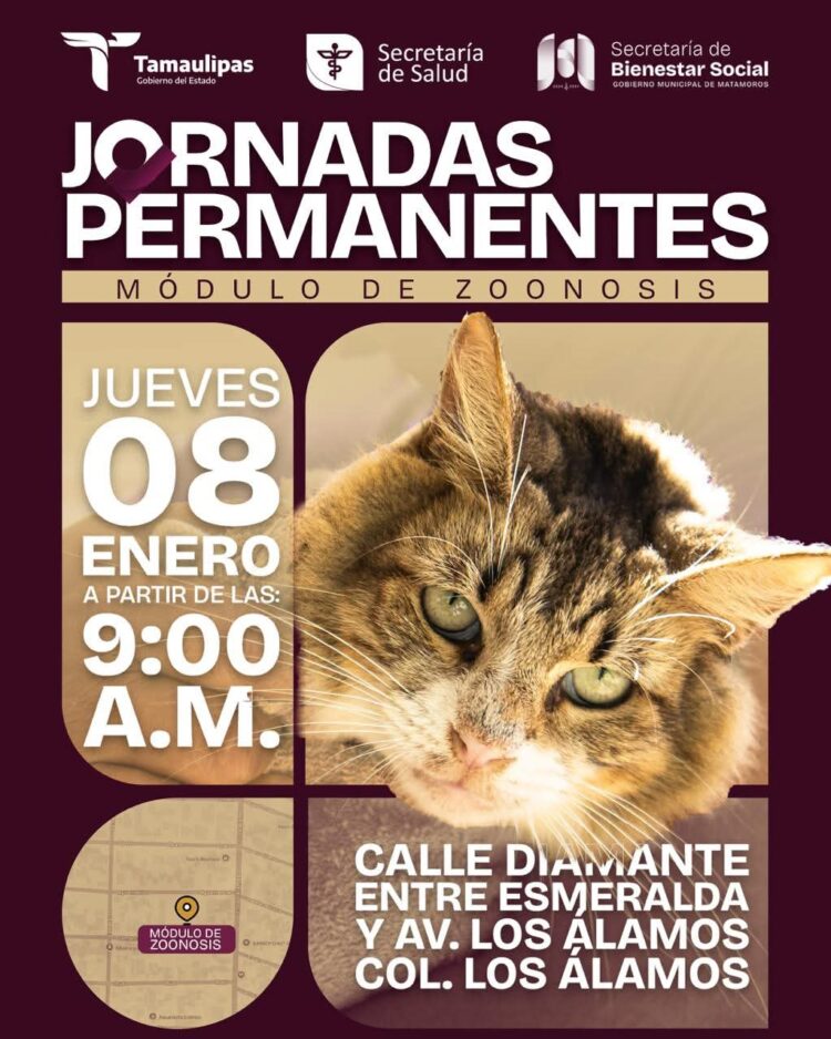 Matamoros, Tam.- El Gobierno de Beto Granados continúa fortaleciendo las acciones en favor de la salud pública y el bienestar animal a través de las Jornadas Permanentes del Módulo de Zoonosis, las cuales se llevarán a cabo este jueves 8 de enero a partir de las 9:00 de la mañana.