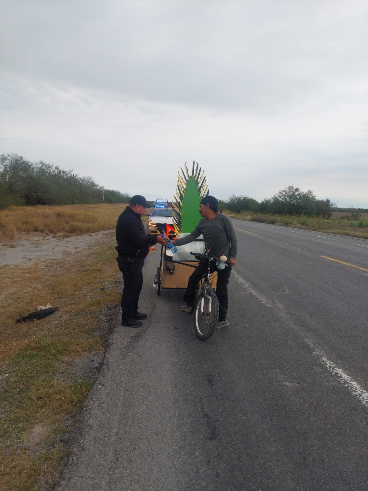 San Fernando, Tamaulipas.- Cumpliendo una manda religiosa, un ciclista residente del municipio de Reynosa partió con rumbo a El Chorrito a bordo de una bicicleta tricarga trasladando una figura de la Virgen de Guadalupe.
