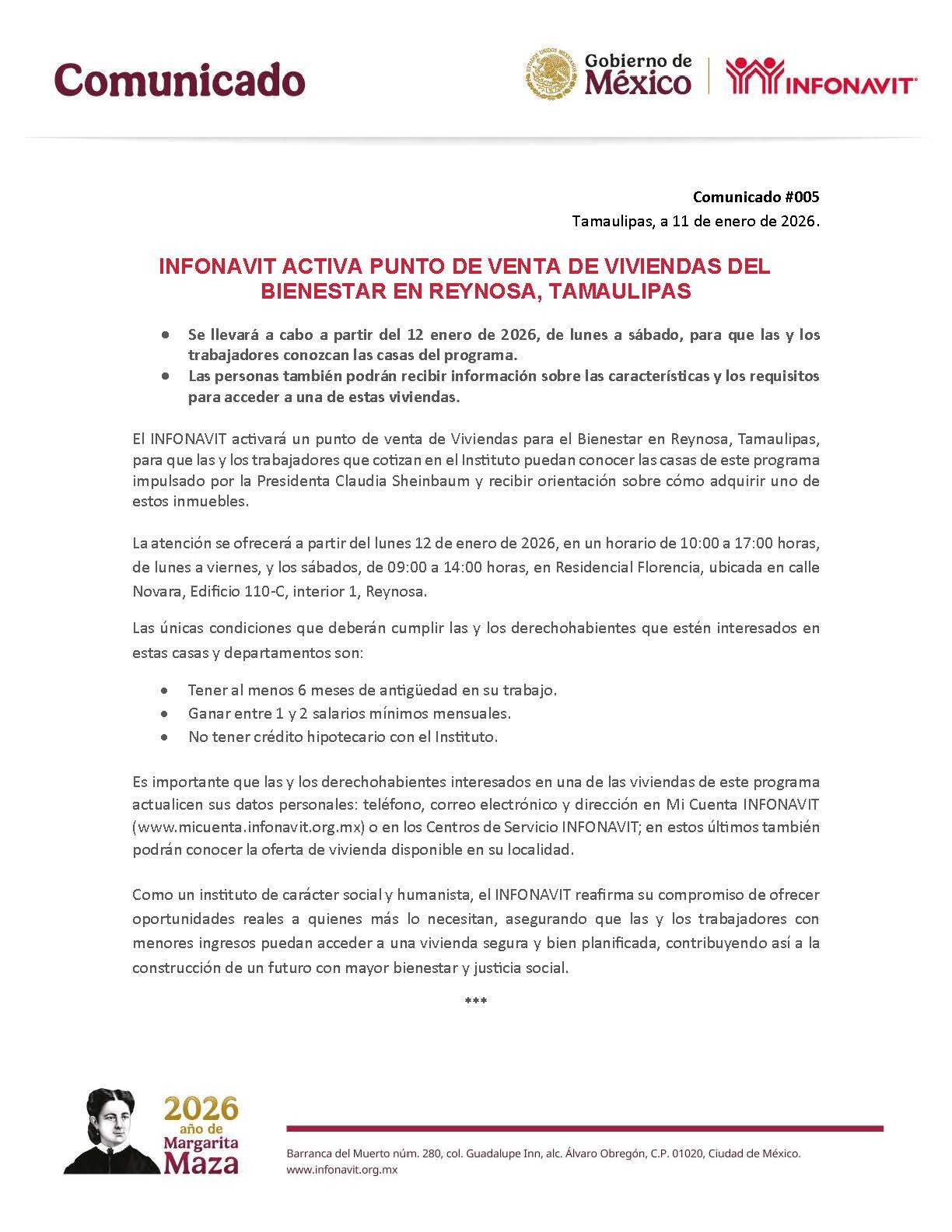 El INFONAVIT activará un punto de venta de Viviendas para el Bienestar en Reynosa, Tamaulipas, para que las y los trabajadores que cotizan en el Instituto puedan conocer las casas de este programa impulsado por la Presidenta Claudia Sheinbaum y recibir orientación sobre cómo adquirir uno de estos inmuebles.
