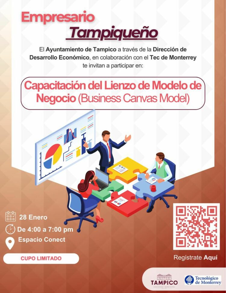 El Ayuntamiento de Tampico liderado por nuestra Presidenta Municipal la Lic. Monica Villareal Anaya, a través de la Dirección de Desarrollo Económico, te invita a participar en esta Capacitacion del Lienzo de Modelo de Negocio (Business Canvas Model)