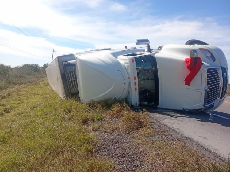 Jiménez, Tamaulipas.- La circulación vehicular se encuentra parcialmente suspendida en el carril de sur a norte, tras la volcadura de un tractocamión sobre la Carretera Federal 101 Victoria–Matamoros.