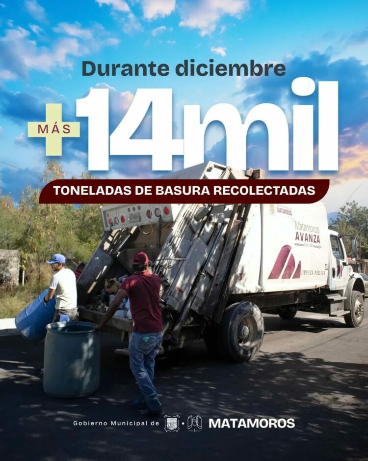 Matamoros, Tam.- El Gobierno de Beto Granados intensificó durante el mes de diciembre las acciones de limpieza en toda la ciudad, logrando la recolección de más de 14 mil toneladas de basura, la cifra más alta registrada en el año. Estos trabajos se realizaron en avenidas principales, colonias, plazas y diversos espacios públicos, como parte de una estrategia integral para atender el incremento de desechos generado en la temporada.