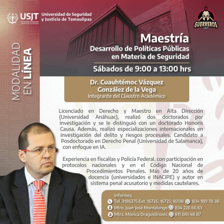 La Universidad de Seguridad y Justicia de Tamaulipas (USJT) te invita a estudiar la Maestría en Desarrollo de Políticas Públicas en Materia de Seguridad, con un Claustro Académico de amplia trayectoria nacional e internacional.