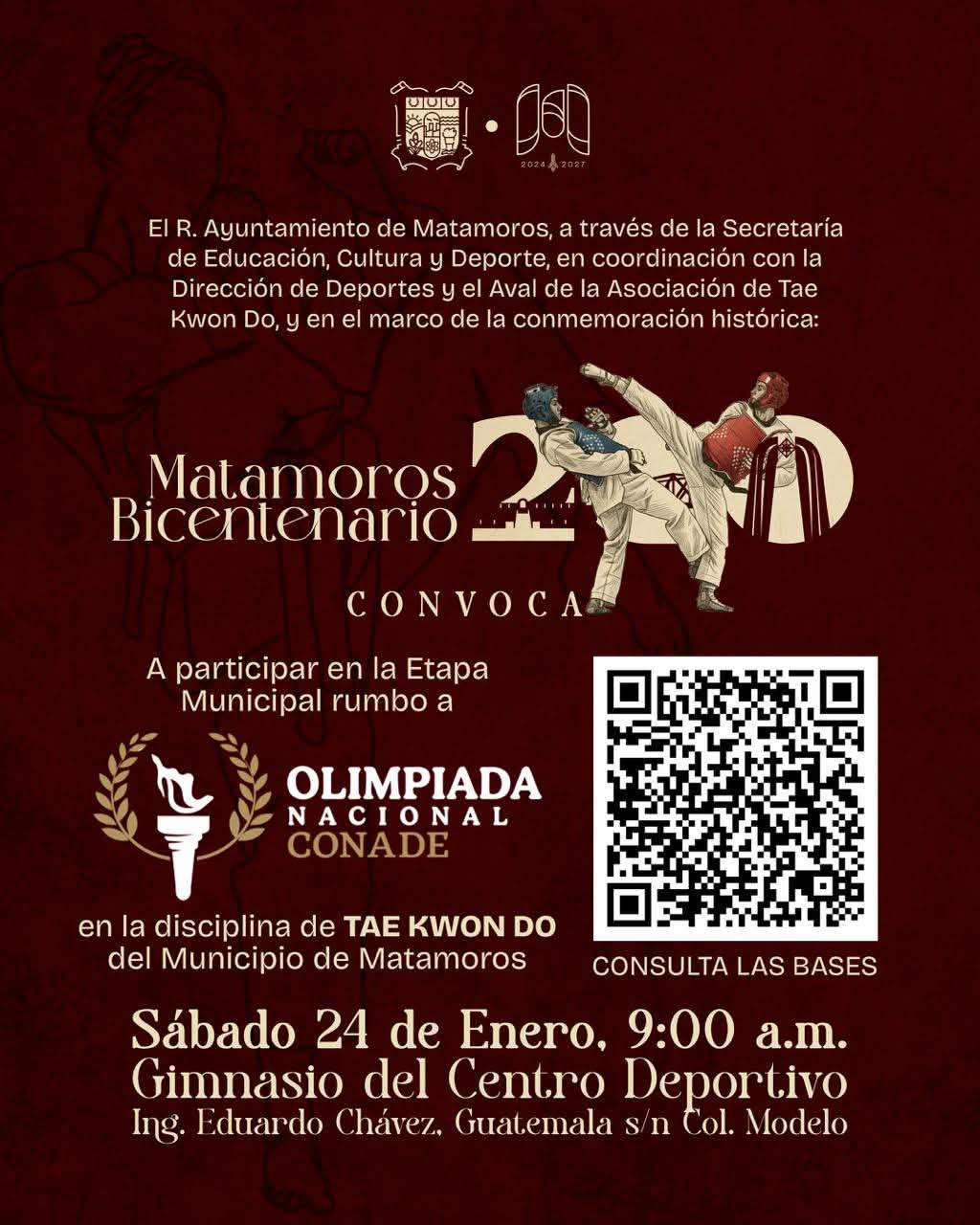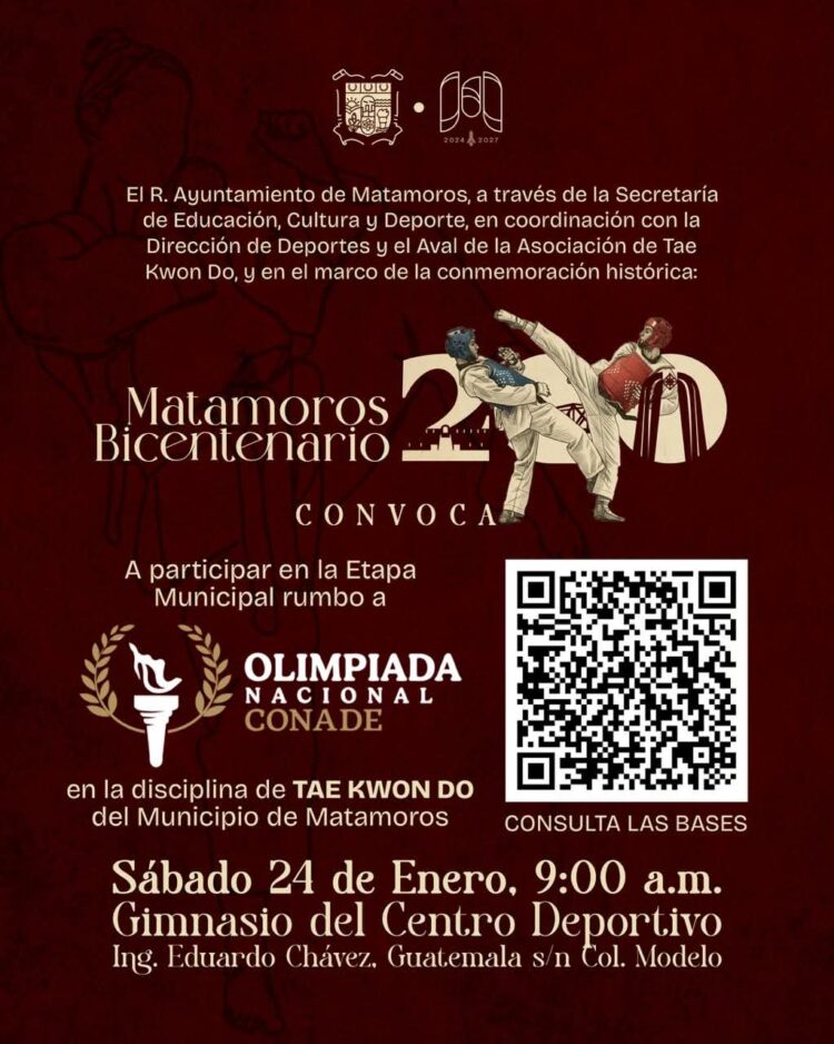 Matamoros, Tamaulipas.- El Gobierno de Beto Granados anunció la realización de la Etapa Municipal de Tae Kwon Do como parte del proceso rumbo a la Olimpiada Nacional CONADE 2026, brindando a niñas, niños y jóvenes la oportunidad de competir y representar a la ciudad en una de las disciplinas deportivas con mayor tradición y crecimiento.
