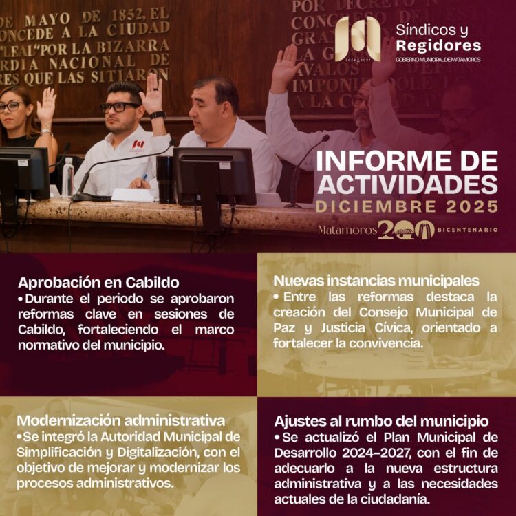 Matamoros, Tam.- El Gobierno de Beto Granados resaltó el trabajo realizado por síndicos y regidores durante el mes de diciembre, quienes impulsaron acciones orientadas a fortalecer la vida pública del municipio, asegurando que las decisiones de gobierno respondan a las necesidades actuales de la ciudadanía en Matamoros.