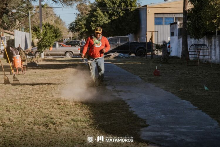 Matamoros, Tamaulipas.- El Gobierno de Beto Granados realiza trabajos de renovación y rehabilitación del área verde de la colonia Encantada, a través de acciones efectuadas por la Cuadrilla Renace, enfocadas en el mantenimiento de los espacios públicos del sector.