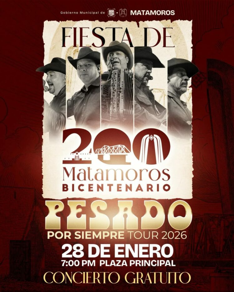 H. Matamoros, Tamaulipas.- En el marco de la celebración del Bicentenario de Matamoros, el alcalde Beto Granados destacó que la llegada de la reconocida agrupación Pesado forma parte de las actividades diseñadas para fortalecer la identidad, la convivencia familiar y la solidaridad entre las y los matamorenses.