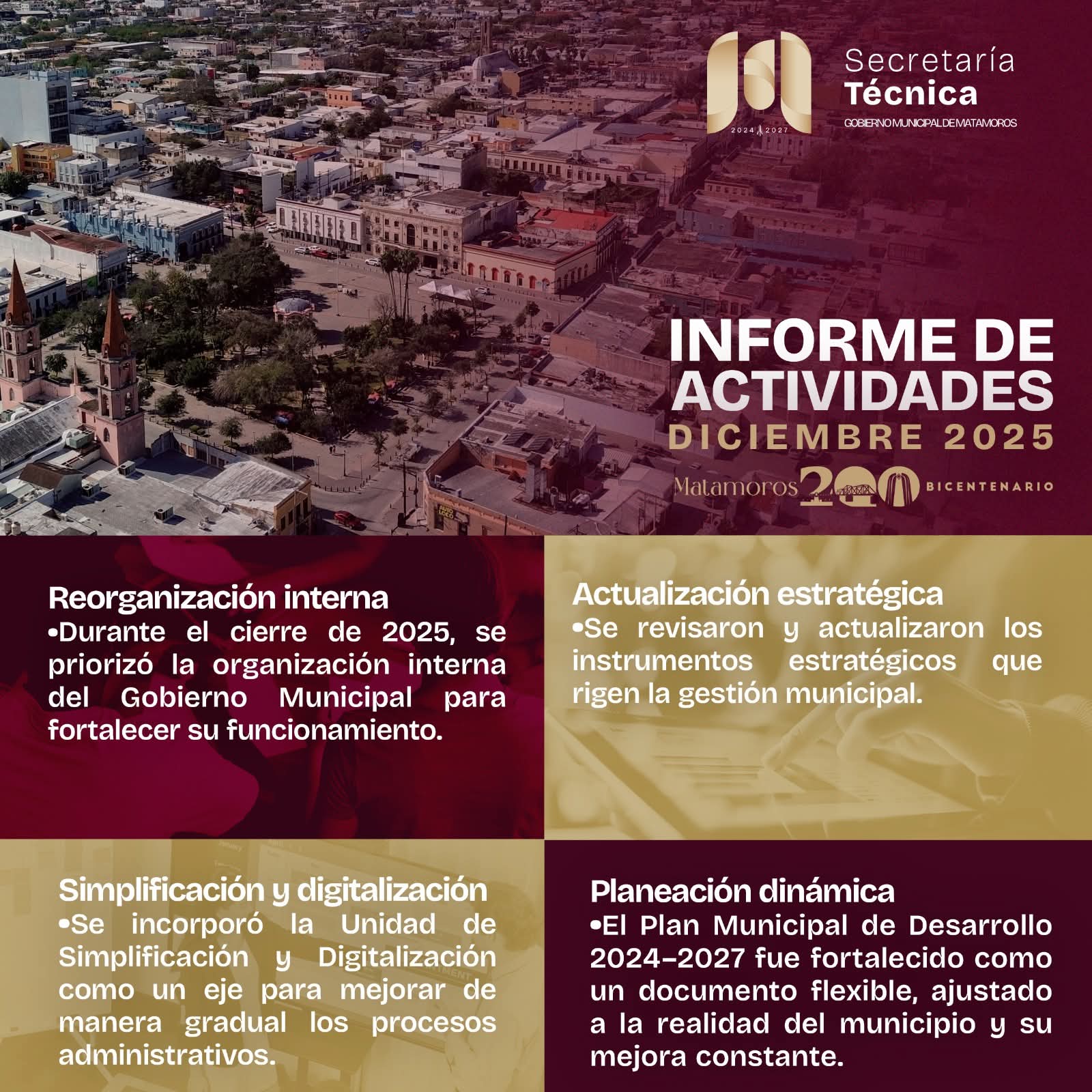 H. Matamoros, Tamaulipas.- Durante el cierre de 2025, la Secretaría Técnica trabajó de manera constante para optimizar la gestión del Gobierno Municipal que encabeza el alcalde Beto Granados, fortaleciendo la planeación y la coordinación entre las distintas áreas de la administración.