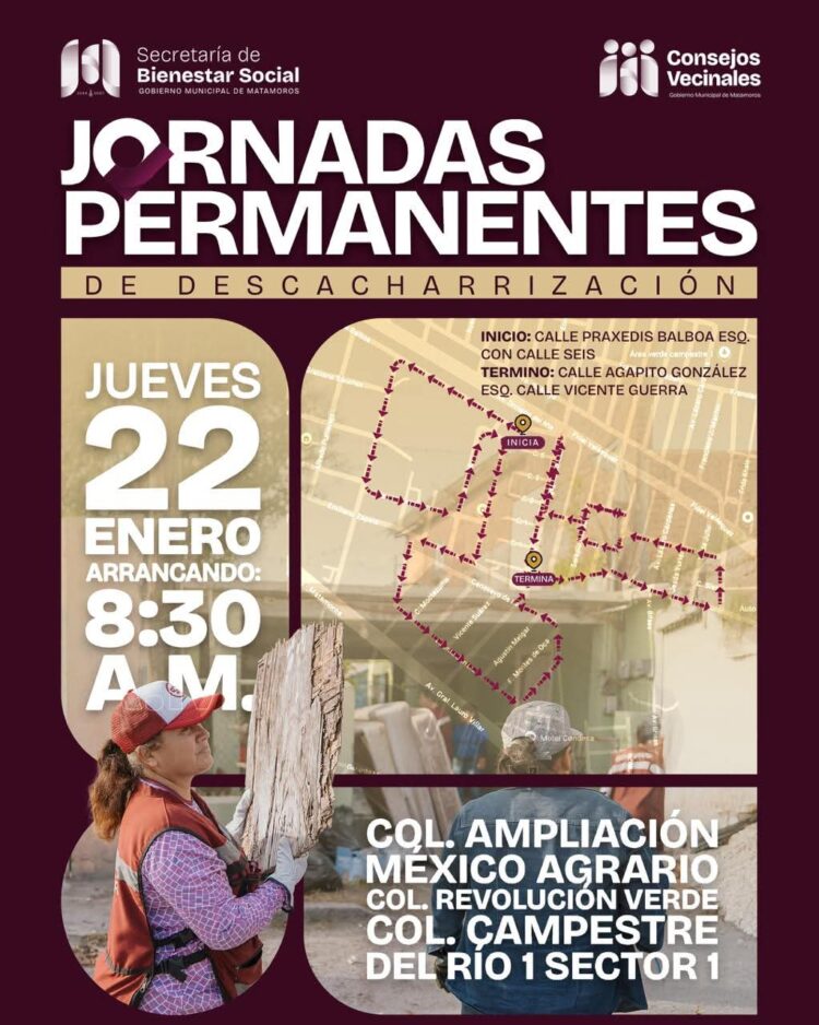 Matamoros, Tam.- El Gobierno de Beto Granados, a través de la Secretaría de Bienestar Social y en coordinación con los Consejos Vecinales, llevará a cabo las Jornadas Permanentes de Descacharrización este jueves 22 de enero, con el objetivo de prevenir enfermedades transmitidas por vectores y fortalecer la salud pública en Matamoros.
