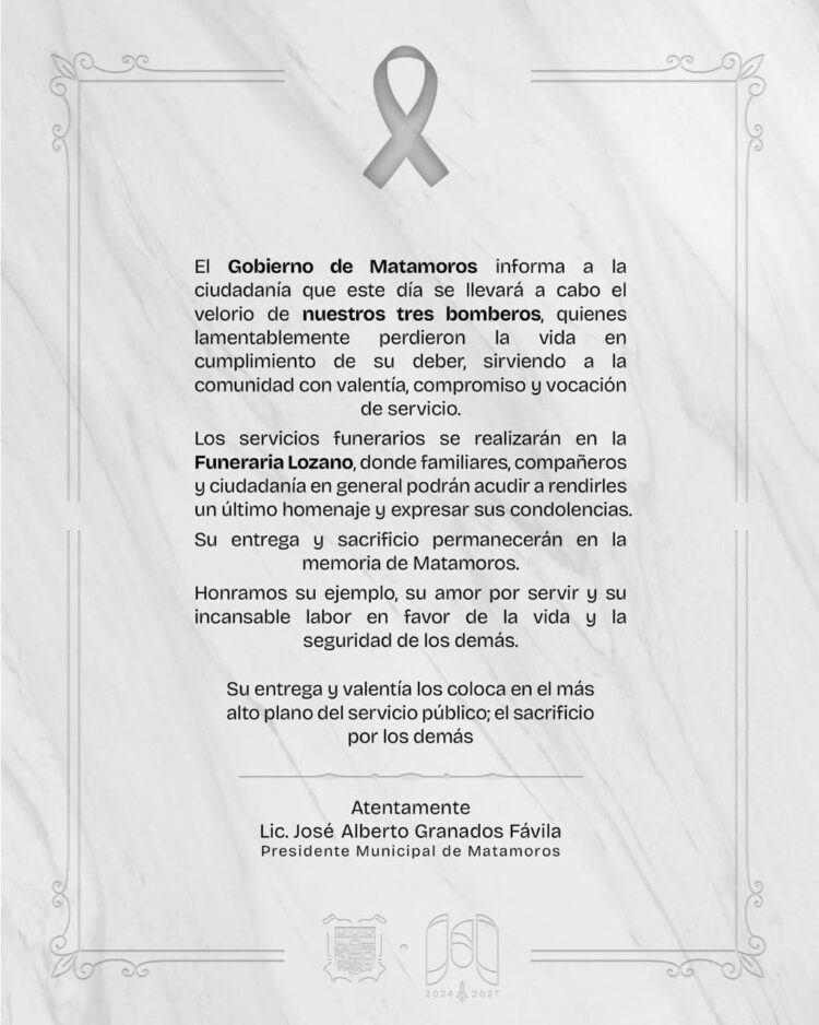 H. Matamoros, Tamaulipas.- Con profundo respeto y dolor, el Gobierno de Matamoros, encabezado por el alcalde Beto Granados, informa que la ciudad despide a tres hombres cuya valentía, entrega y vocación de servicio dejaron una huella imborrable en la historia y el corazón de la comunidad.