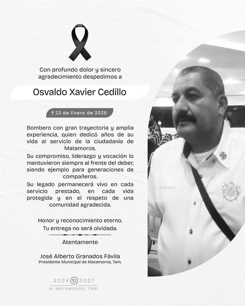 Con una trayectoria ejemplar y años de servicio dedicados a la protección de la vida y el bienestar de la ciudadanía, el Comandante Osvaldo Xavier Cedillo se distinguió por su liderazgo, experiencia y compromiso inquebrantable. Siempre al frente de las emergencias, su actuar fue reflejo de un profundo amor por Matamoros y de un sentido del deber que lo acompañó hasta el último momento.