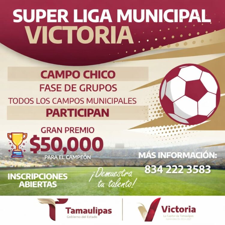 Cd. Victoria, 24 de enero de 2026. – A partir de febrero y con una bolsa de 50 mil pesos en premios, el Gobierno de Victoria de Eduardo Gattás Báez, pondrá en marcha la Súper Liga de Fútbol 7, 8 ó 9, según las dimensiones de los campos administrados por el Municipio, a través del Departamento del Deporte y la Juventud.
