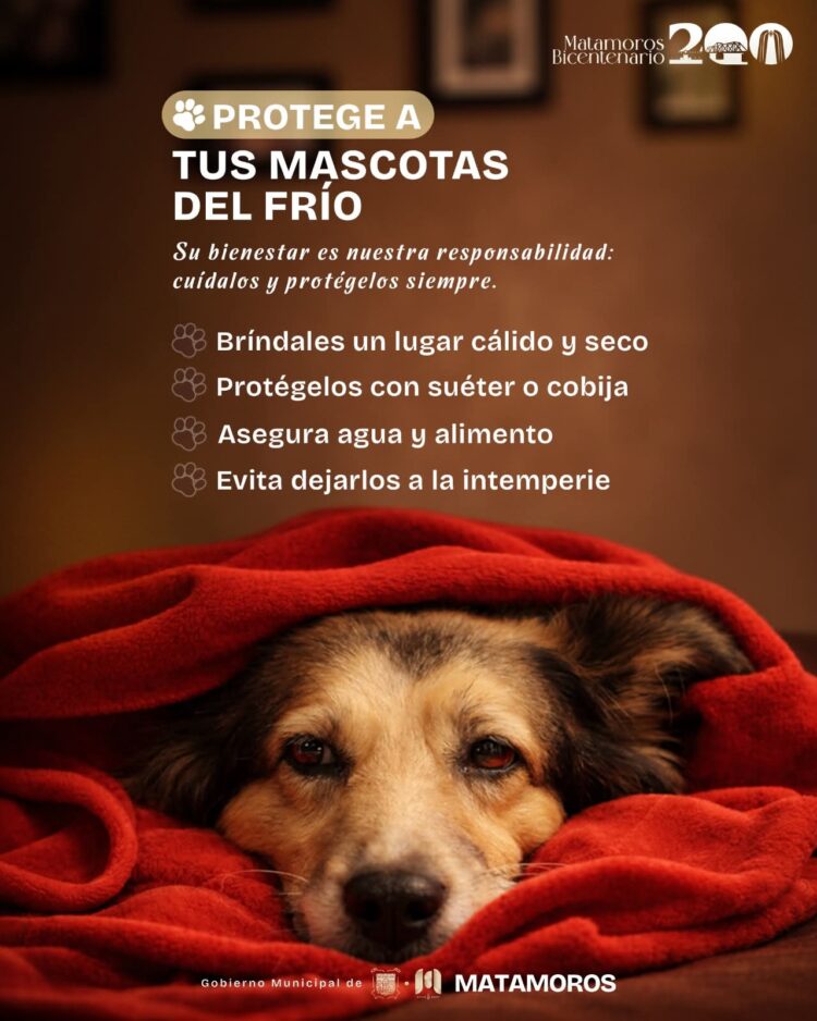 Matamoros, Tam.- Ante el pronóstico de bajas temperaturas para este fin de semana, el Gobierno de Beto Granados hizo un llamado a la ciudadanía para reforzar el cuidado de las mascotas, recordando que el frío puede afectar seriamente su salud si no se toman las medidas adecuadas.