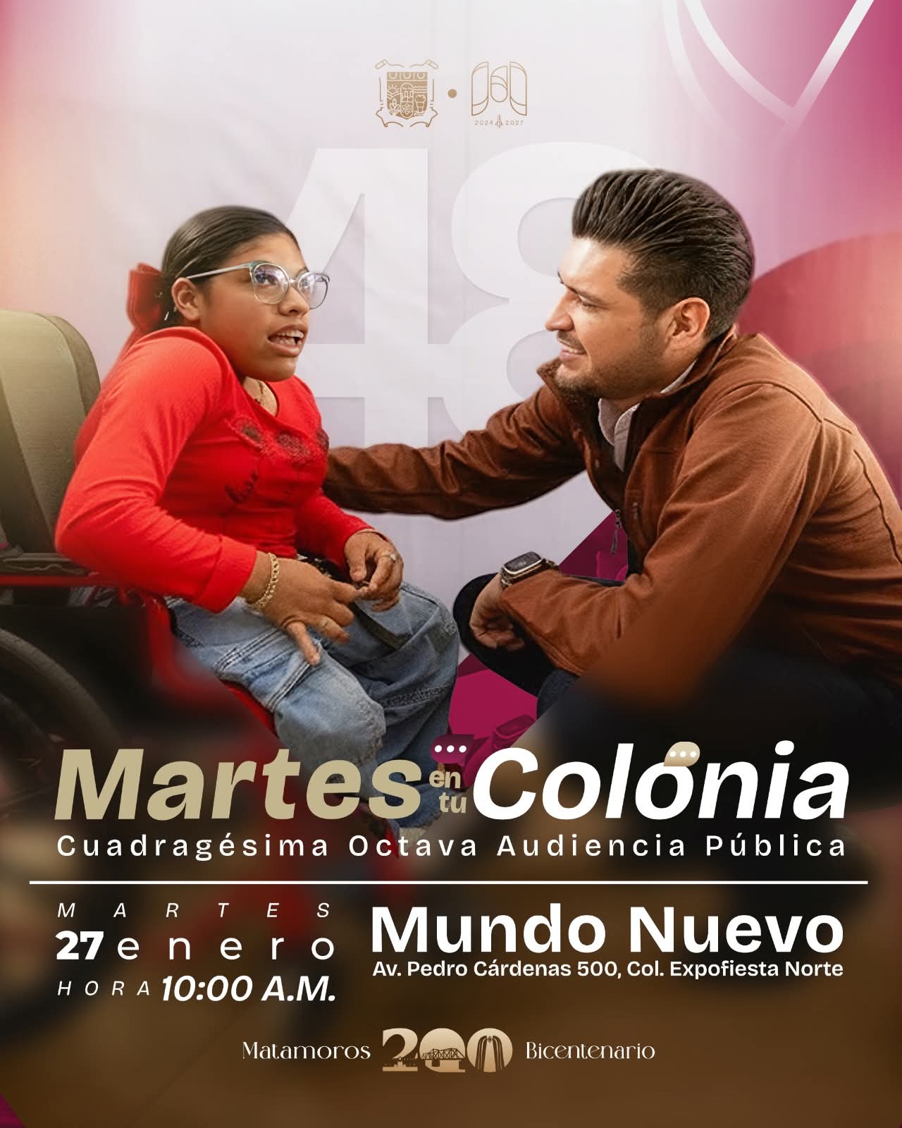 Matamoros, Tam.- El Gobierno Municipal de Matamoros, encabezado por el presidente municipal José Alberto Granados Fávila, realizará este martes 27 de enero una nueva jornada del programa “Martes en tu Colonia”, en el Centro de Convenciones Mundo Nuevo, como parte de su política de atención directa y cercanía con la ciudadanía.