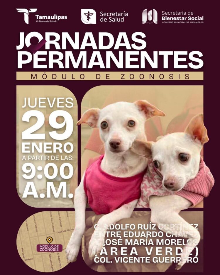 Matamoros, Tam.— Como parte de las acciones preventivas para proteger la salud de las familias y el bienestar animal, el Gobierno de Beto Granados realizará las Jornadas Permanentes del Módulo de Zoonosis en el área verde de la colonia Vicente Guerrero, sobre la calle Adolfo Ruiz Cortines, acercando servicios gratuitos de vacunación y orientación a la comunidad.