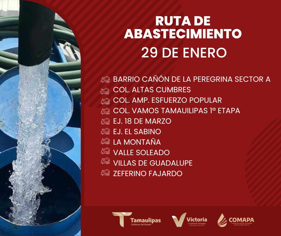 P谩gina de inicioMunicipios Redaccion en Municipios **En COMAPA Victoria trabajamos para que el agua llegue a cada rinc贸n de la ciudad. Te compartimos la ruta de abastecimiento a trav茅s de cami贸n cisterna. 馃挧 隆Juntos hacemos que el agua llegue a todos! Comparte esta informaci贸n con tus vecinos. Pr贸xima Lectura: **Aprueba Cabildo destinar inversi贸n adicional al plan de obra p煤blica en Victoria. » Redaccion: Entrada Relacionada **Le cumple Lalo Gatt谩s a su gente y Victoria. Convoca DIF Matamoros a las familias del Fraccionamiento C谩nada a cuidar de la salud visual con examen de la vista y entrega de lentes Gobierno de Beto Granados rehabilita espacios p煤blicos en la colonia Encantada