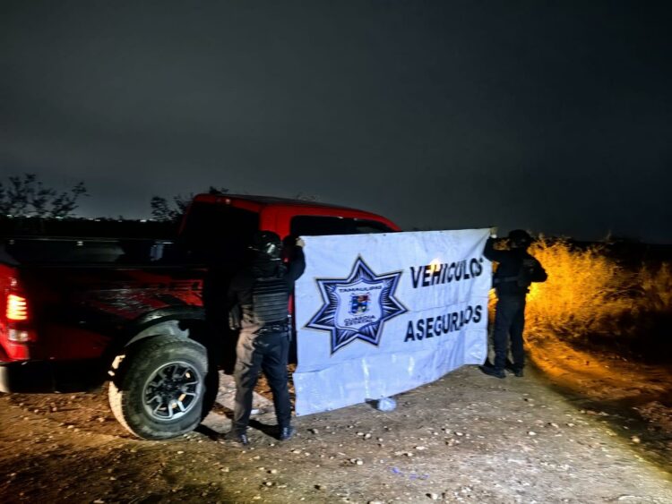Reynosa, Tamaulipas.- Durante un recorrido de vigilancia realizado en brechas de Reynosa, personal de la Guardia Estatal aseguró una camioneta, un arma larga y artefactos metálicos conocidos como ponchallantas, luego de que los ocupantes del vehículo huyeron al detectar la presencia policial.