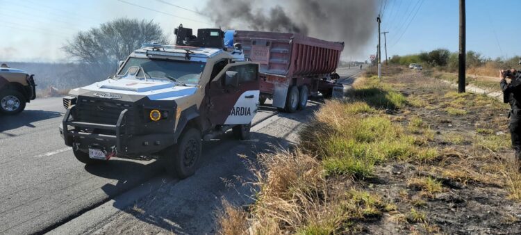 Gustavo Díaz Ordaz, Tamaulipas.– Personal de la Guardia Estatal, en coordinación con Protección Civil Municipal, atendieron un reporte de bloqueo y corte de la circulación tras el incendio de un tráiler, registrado en el municipio de Gustavo Díaz Ordaz.