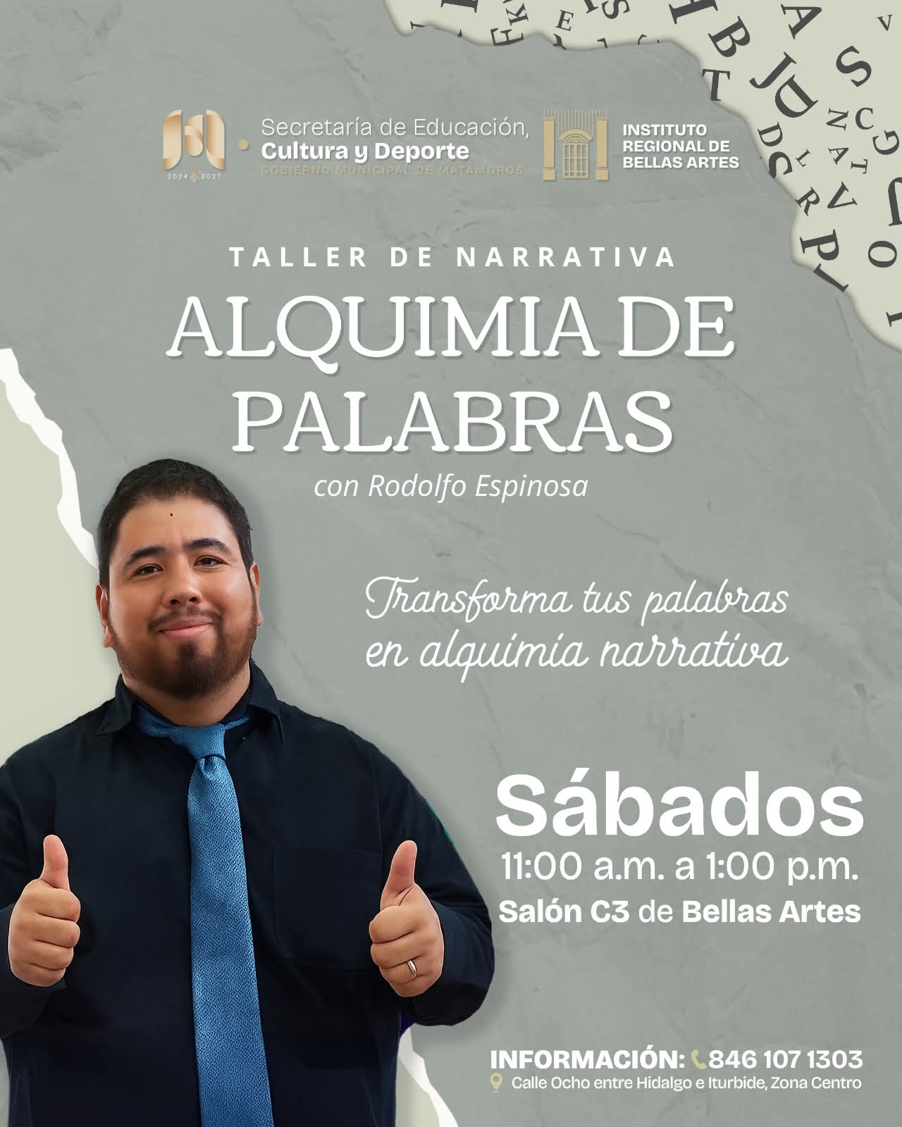 H. Matamoros, Tamaulipas.- El Instituto Regional de Bellas Artes Matamoros invita a la ciudadanía a participar en el Taller de Narrativa “Alquimia de Palabras”, un espacio formativo dedicado a la exploración de la escritura creativa y la transformación de ideas en historias, bajo la guía del escritor Rodolfo Espinosa.