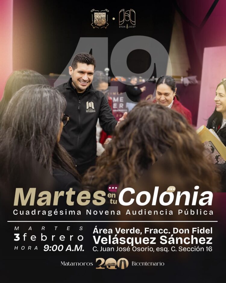 H. Matamoros, Tamaulipas.- Con el objetivo de fortalecer la cercanía con la ciudadanía y brindar atención directa a las familias de Matamoros, este martes se llevará a cabo la Audiencia Pública, edición 49, en el área verde del Fraccionamiento Don Fidel Velázquez.