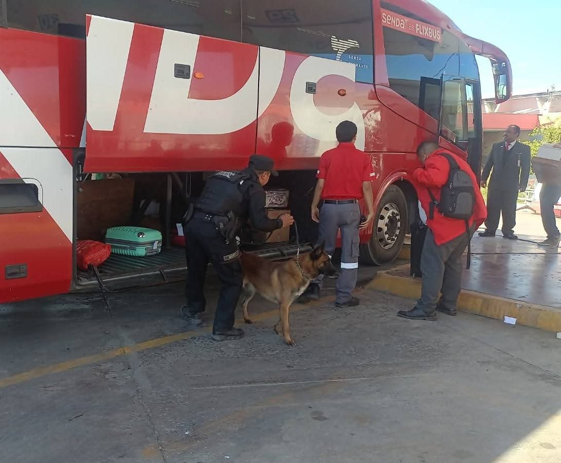 El binomio canino “Max” está especializado en detección de narcóticos, por lo que fue desplegado para realizar un barrido preventivo en pasillos, sala de espera, andenes, áreas comunes y el área de paquetería.
