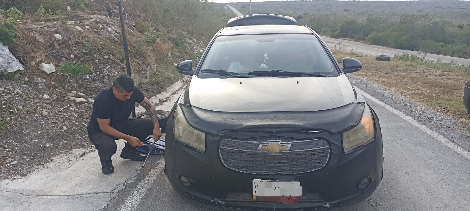Abasolo, Tamaulipas.- Personal de la Guardia Estatal brindó apoyo carretero a un automovilista que quedó varado por una falla mecánica en la Carretera Estatal 75, en el tramo Villa de Casas–Soto la Marina, a la altura del kilómetro 36 en Abasolo.