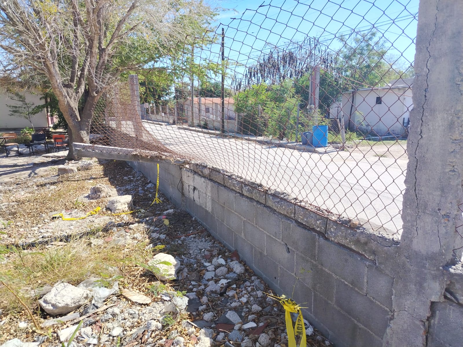 De hecho, dijo, ya acordonamos el área para que los alumnos no se acerquen a la barda, «porque como te digo está a punto de caerse y por eso no dejamos que los niños jueguen en esa área».