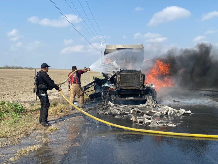 Gustavo Díaz Ordaz, Tamaulipas.- Personal de la Guardia Estatal atendió el incendio de un tráiler sobre la Carretera Federal 02 en el municipio de Gustavo Díaz Ordaz.