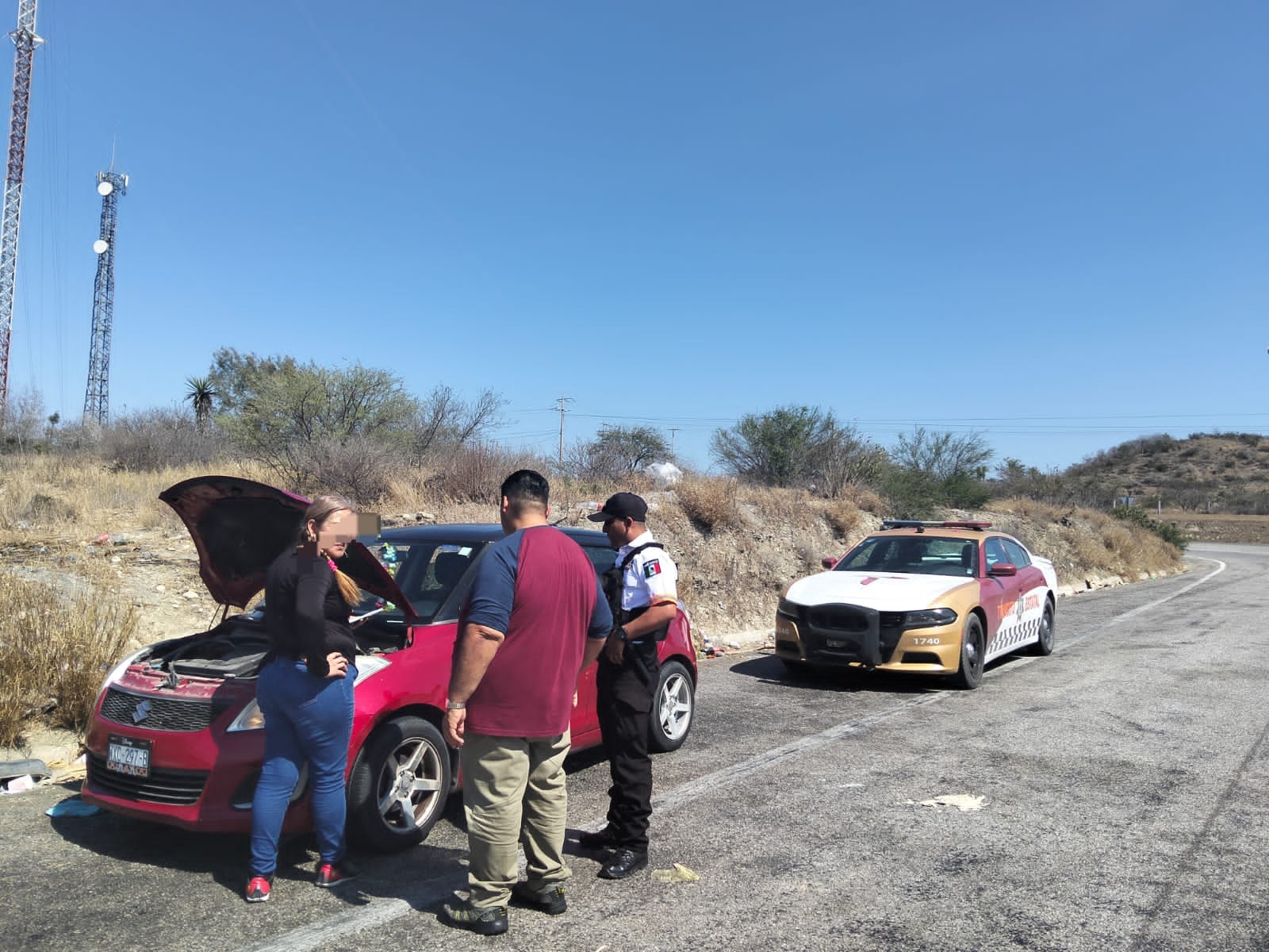 Durante recorridos de seguridad y vigilancia, los oficiales visualizaron un vehículo suzuki swift detenido sobre el acotamiento, por lo que procedieron a entrevistarse con la conductora, quien explicó que su unidad presentó una falla mecánica y que requería trasladarla hasta el municipio de Tampico.