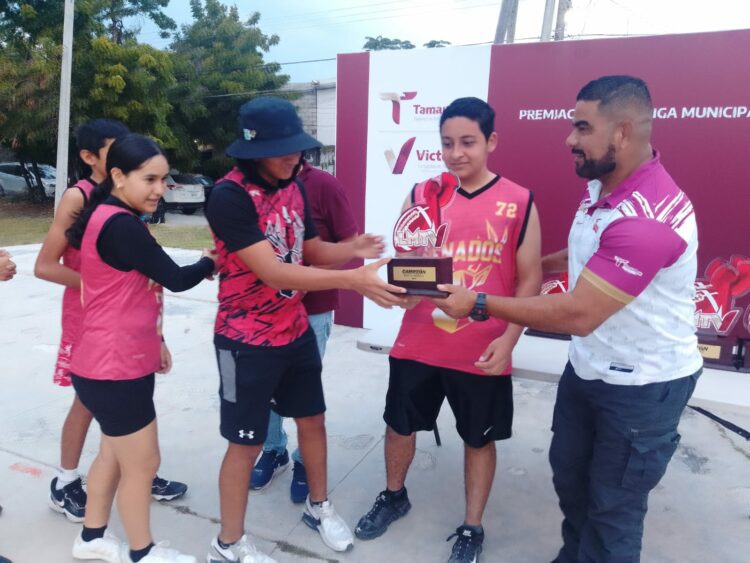 Cd. Victoria, 22 de febrero de 2026.- En representación del alcalde Eduardo Gattás Báez, el jefe del Departamento del Deporte y la Juventud, Carlos Pizaña encabezó la premiación a las y los campeones de la primera temporada oficial de la Liga Municipal de Tochito Victoria.