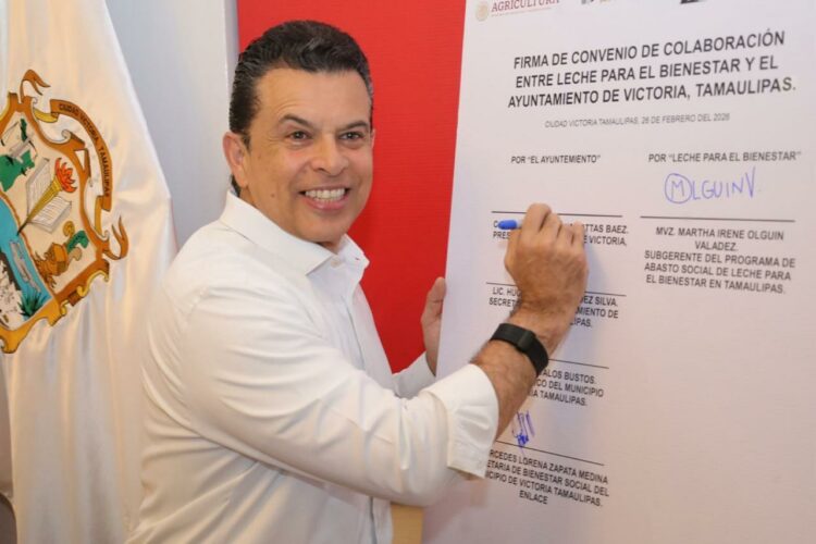 Cd. Victoria, 26 de febrero de 2026.- Garantizando el acceso a programas que impactan directamente en la nutrición y economía de los victorenses, el alcalde Eduardo Gattás Báez firmó convenio de colaboración con el programa “leche para el bienestar”, inaugurando en presidencia punto de venta y afiliación.